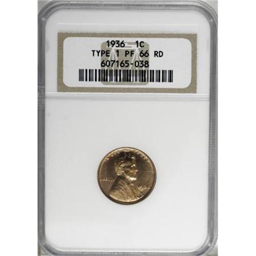 <B>1936 1C Type One--Satin Finish PR66 Red NGC.</B></I> Crisply defined on every detail, including Lincoln's hair and beard. The reflective surfaces display even red-gold toning across the obverse, and subtle variations of copper-gold and sunset-red on the reverse. Several interesting, tiny die lumps reside between and just beneath the letters of CENT. A great Premium Gem specimen of the 1936 Satin Finish Lincoln cent, produced only in this year. Census: 6 in 66 Red, 0 finer (12/07). <BR><BR><B>Coin Engraver:</B> Victor D. Brenner<BR><BR><b>Shipping:</b> Coins & Currency (<a target="_blank" href="http://www.heritageauctions.com/common/shipping.php">view shipping information</a>)