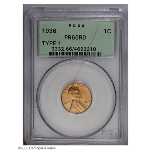 <B>1936<1C> Type One--Satin Finish PR66 Red PCGS.</B></I> Well struck and carefully preserved, with lovely orange-tan color and seemingly contact-free surfaces. The reverse displays a small light-brown spot, between the N and T of CENT, and a small number of scattered flyspecks in the right reverse fields. Population: 23 in 66 Red, 1 finer (9/05).<BR><I>From The Sounder Collection.</B></I>