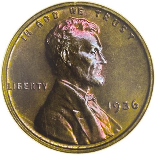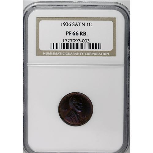 <B>1936<1C> Type One--Satin Finish PR66 Red and Brown NGC.</B></I> Iridescent ruby-red, purple, and tan-brown colors swirl about the nearly pristine surfaces. A boldly struck Premium Gem proof, and highly elusive in this lofty grade. Census: 7 in 66, 1 finer (7/06).