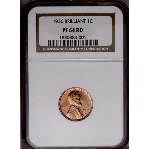 <B>1936<1C> Type Two--Brilliant Finish PR64 Red NGC.</B></I> Unlike the earlier satin proofs, this piece has a brilliant finish. Crisply struck and deeply mirrored with thoroughly original orange-red color. Faint hairlines in the obverse fields and small carbon spots on the reverse limit the grade.