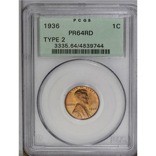 <B>1936<1C> Type Two--Brilliant Finish PR64 Red PCGS.</B></I> An exceptionally attractive proof striking that is deeply mirrored on each side and the rich red luster shows only slight variation in hue. Slight haziness and a few tiny specks of carbon account for the less-than-Gem grade. <BR><BR><B>Important notice:</B> Heritage usually auctions material at the rate of 200-250 lots per hour. On some occasions eBay Live bid software or the Internet may not be able to keep up with the pace of the auction. We recommend placing a realistic absentee bid now as insurance to avoid disappointment. Occasionally the auctioneer may eliminate or reject an eBay Live bid, and the auctioneer may also reopen a lot after the close of the eBay live bidding (usually because we missed an audience bid), and may reject your bid even if it shows you as the winning bidder. By bidding via eBay Live, you agree that Heritage may award the lot to another bidder at its sole discretion under the circumstances described above or any other reasonable circumstances. Since eBay bids are not shown to us until we open the lot on the floor, we treat those bids just like floor bids. In most cases the floor responds before the eBay bid is presented to us, due to Internet lag time, so for consistency we have made it a policy that floor bids are always considered first over tie eBay live bids. Also please note that all Heritage lots purchased through eBay Live carry a 20% Buyer's Premium. Please make sure you read the Terms and Conditions before you bid. This lot is being auctioned in conjunction with a live floor auction by Heritage Galleries & Auctioneers. All final auction and invoice information will be supplied by Heritage Galleries & Auctioneers, and all other information should be considered preliminary. Lot:703 <BR><BR><B>Winning Notification and Billing:</B> After the FINAL session in this auction is complete, Heritage will send e-mail and snail mail invoices. This process normally takes several days. All final auction and invoice information will be supplied by Heritage Galleries & Auctioneers, and all other information should be considered preliminary. <BR><BR>This auction will be conducted on a live auction floor and over the Internet through eBay Live. If you choose to place an absentee bid, please take a moment to <font color='#0000ff'><u><a href='http://pages.ebay.com/liveauctions/help/before/laabsentee.html'>learn how eBay Live absentee bidding works</a></u></font><font color='#000000'>