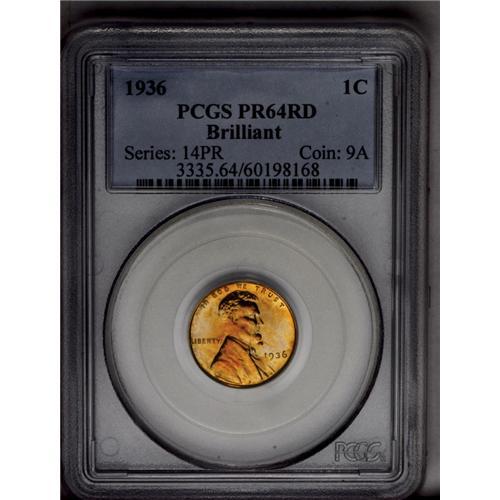 <B>1936<1C> Type Two--Brilliant Finish PR64 Red PCGS.</B></I> Brilliant lime-golden surfaces are accented with splashes of crimson-magenta on each side. Just a few minor hairlines are seen that limit the grade. An especially appealing example for the assigned Proof 64 grade.