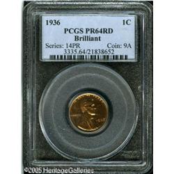 <B>1936 1C Type Two--Brilliant Finish PR64 Red PCGS.</B></I> Bright and flashy, very near Gem quality. A few tiny flyspecks are scattered over both sides. Lot:5619