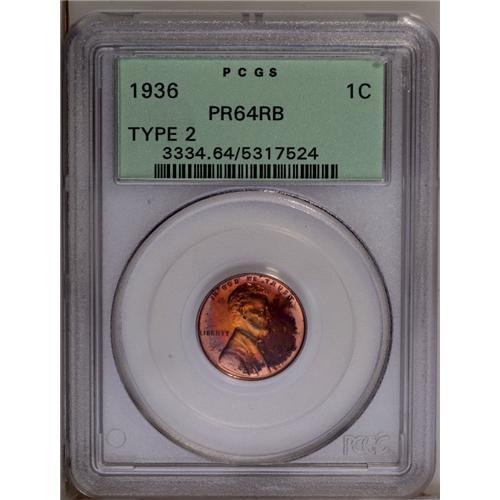 <B>1936<1C> Type Two--Brilliant Finish PR64 Red and Brown PCGS.</B></I> Pumpkin-gold occupies more than 90% of the reverse, while the more colorful obverse is orange and rose with a swath of brown across the right obverse field. Certified in a green label holder.<BR><I>From The Carolina Gold Collection, Part Four.</B></I>