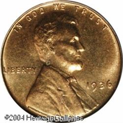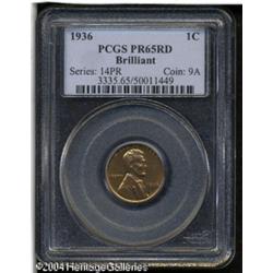 1936 1C Type Two--Brilliant Finish PR65 Red PCGS. <B>1936 1C Type Two--Brilliant Finish PR65 Red PCGS.</B></I> A gorgeous bright orange Gem that has an occasional carbon fleck on each side. Well struck and immaculate. The first year of brilliant proofs for the series, with the low mintage shared by satin finish examples. <BR><BR><B>Important notice:</B> Heritage usually auctions material at the rate of 200-250 lots per hour. On some occasions eBay Live bid software or the Internet may not be able to keep up with the pace of the auction. We recommend placing a realistic absentee bid now as insurance to avoid disappointment. Occasionally the auctioneer may eliminate or reject an eBay Live bid, and the auctioneer may also reopen a lot after the close of the eBay live bidding (usually because we missed an audience bid), and may reject your bid even if it shows you as the winning bidder. By bidding via eBay Live, you agree that Heritage may award the lot to another bidder at its sole discretion under the circumstances described above or any other reasonable circumstances. Since eBay bids are not shown to us until we open the lot on the floor, we treat those bids just like floor bids. In most cases the floor responds before the eBay bid is presented to us, due to Internet lag time, so for consistency we have made it a policy that floor bids are always considered first over tie eBay live bids. Also please note that all Heritage lots purchased through eBay Live carry a 20% Buyer's Premium. Please make sure you read the Terms and Conditions before you bid. This lot is being auctioned in conjunction with a live floor auction by Heritage Galleries & Auctioneers. All final auction and invoice information will be supplied by Heritage Galleries & Auctioneers, and all other information should be considered preliminary. Lot:5413