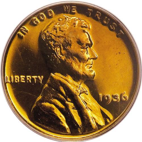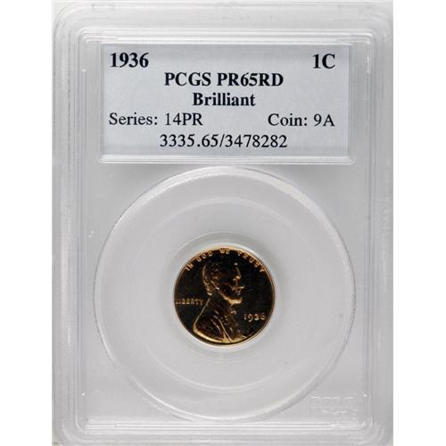 <B>1936 1C Type Two--Brilliant Finish PR65 Red PCGS.</B></I> This is a gorgeous Gem proof example with deep orange color on both sides. The fields are deeply mirrored, surrounding reflective devices, limiting the amount of cameo contrast to a minimum. Not many finer quality examples have been certified, just 27 by PCGS (10/06).<BR><I>From The Park Cities Collection.</B></I><BR><BR><b>Shipping:</b> Coin/Currency (<a target="_blank" href="http://www.heritageauctions.com/common/shipping.php">view shipping information</a>)