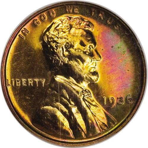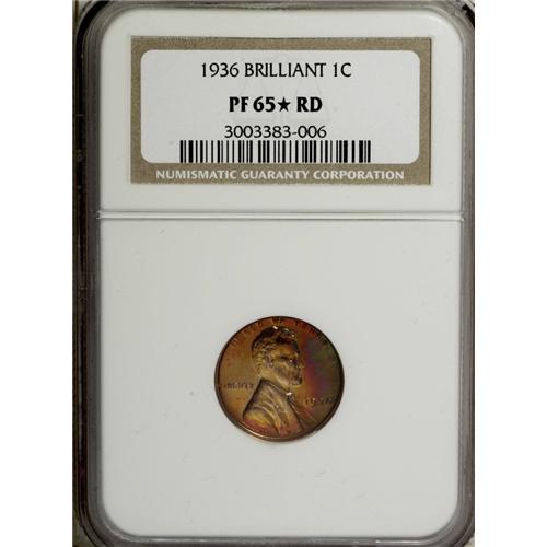 <B>1936 1C Type Two--Brilliant Finish PR65 <img border='0' src='http://www.heritagecoins.com/images/star.gif' width=10 height=10> Red NGC.</B></I> The Star designation is no doubt awarded for the gorgeous patination on both sides, with fuchsia and jade-green predominating. The Brilliant Finish proofs of this year came late and were poorly publicized after the Satin Finish debacle, and today few pieces are encountered.<BR><BR><b>Shipping:</b> Coin/Currency (<a target="_blank" href="http://www.heritageauctions.com/common/shipping.php">view shipping information</a>)