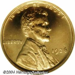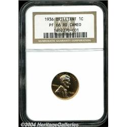 <B>1936<1C> Type Two--Brilliant Finish PR66 Red Cameo NGC.</B></I> Doubly important both as a first year of issue as well as a cameo in a series that is not known for field-to-device contrast. This lovely coin has full cherry-red coloration and deeply mirrored fields on each side. The devices are moderately frosted and seem even more so against the illimitable depth of reflectivity in the fields. There are no mentionable marks or spots on either side of this important coin. Population: 21 in 66 Cameo, 2 finer (7/04). <BR><BR><B>Important notice:</B> Heritage usually auctions material at the rate of 200-250 lots per hour. On some occasions eBay Live bid software or the Internet may not be able to keep up with the pace of the auction. We recommend placing a realistic absentee bid now as insurance to avoid disappointment. Occasionally the auctioneer may eliminate or reject an eBay Live bid, and the auctioneer may also reopen a lot after the close of the eBay live bidding (usually because we missed an audience bid), and may reject your bid even if it shows you as the winning bidder. By bidding via eBay Live, you agree that Heritage may award the lot to another bidder at its sole discretion under the circumstances described above or any other reasonable circumstances. Since eBay bids are not shown to us until we open the lot on the floor, we treat those bids just like floor bids. In most cases the floor responds before the eBay bid is presented to us, due to Internet lag time, so for consistency we have made it a policy that floor bids are always considered first over tie eBay live bids. Also please note that all Heritage lots purchased through eBay Live carry a 20% Buyer's Premium. Please make sure you read the Terms and Conditions before you bid. </span></font></tr></table></td></tr></table>