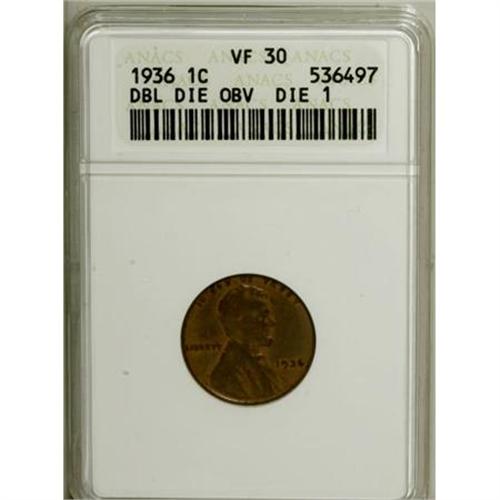 <B>1936 1C Double Die Obverse, Die 1 VF30 ANACS.</B></I> NGC Census: (8/37). PCGS Population (7/28). Mintage: 309,637,568. (#2648)<BR><BR><B>Coin Engraver:</B> Victor D. Brenner<BR><BR><b>Shipping:</b> Coins & Currency (<a target="_blank" href="http://www.heritageauctions.com/common/shipping.php">view shipping information</a>)