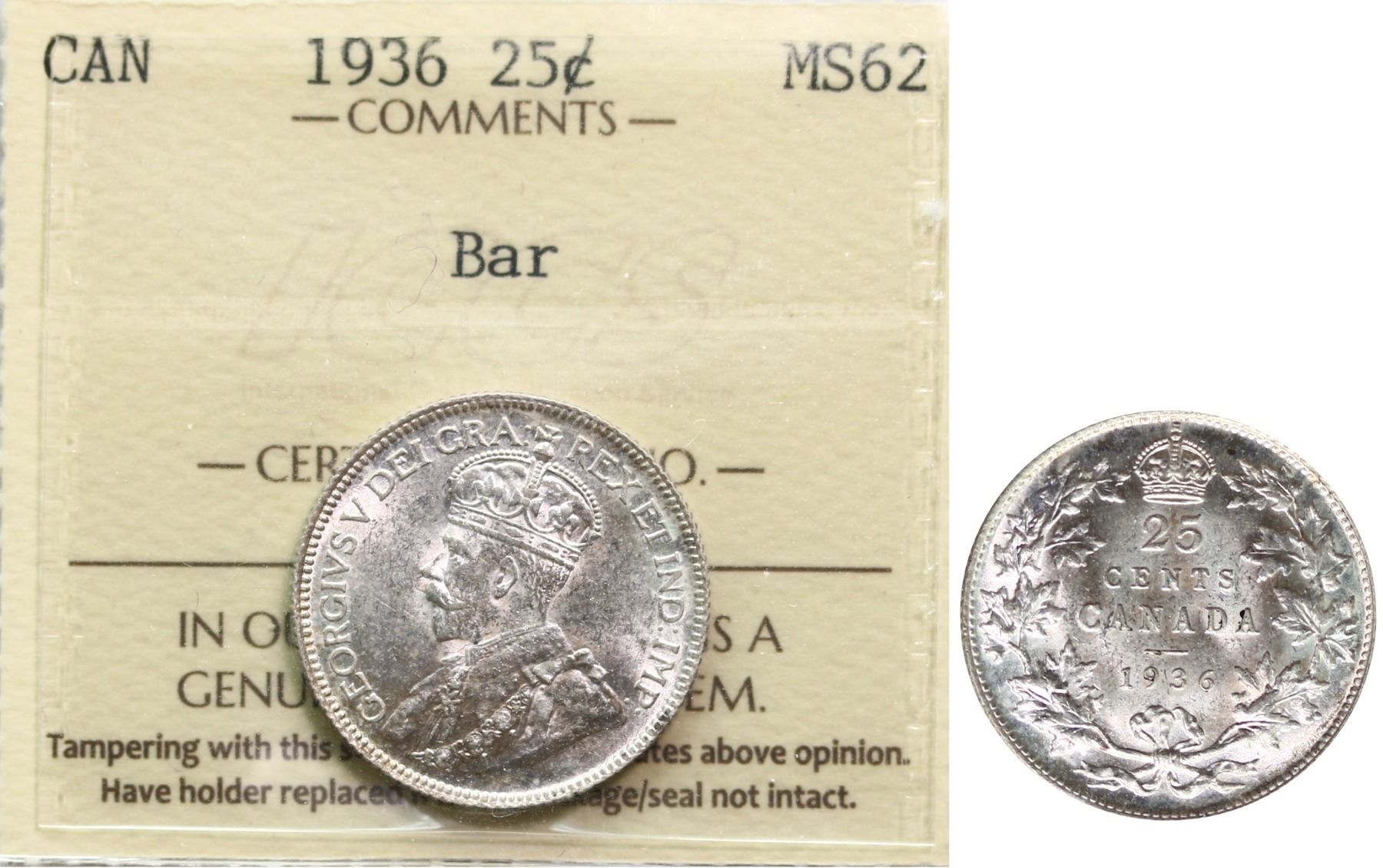 1936 25¢ "Bar" ICCS Choice Mint State-62, Brilliant and lustrous. Attractive and sought after variety.