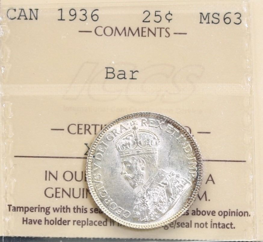 1936 25¢ "Bar" ICCS Choice Mint State-63 brilliant and lustrous. Popular variety.