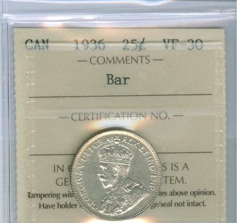 1936 25¢ Bar ICCS VF30. Blast white with very distinct Bar.