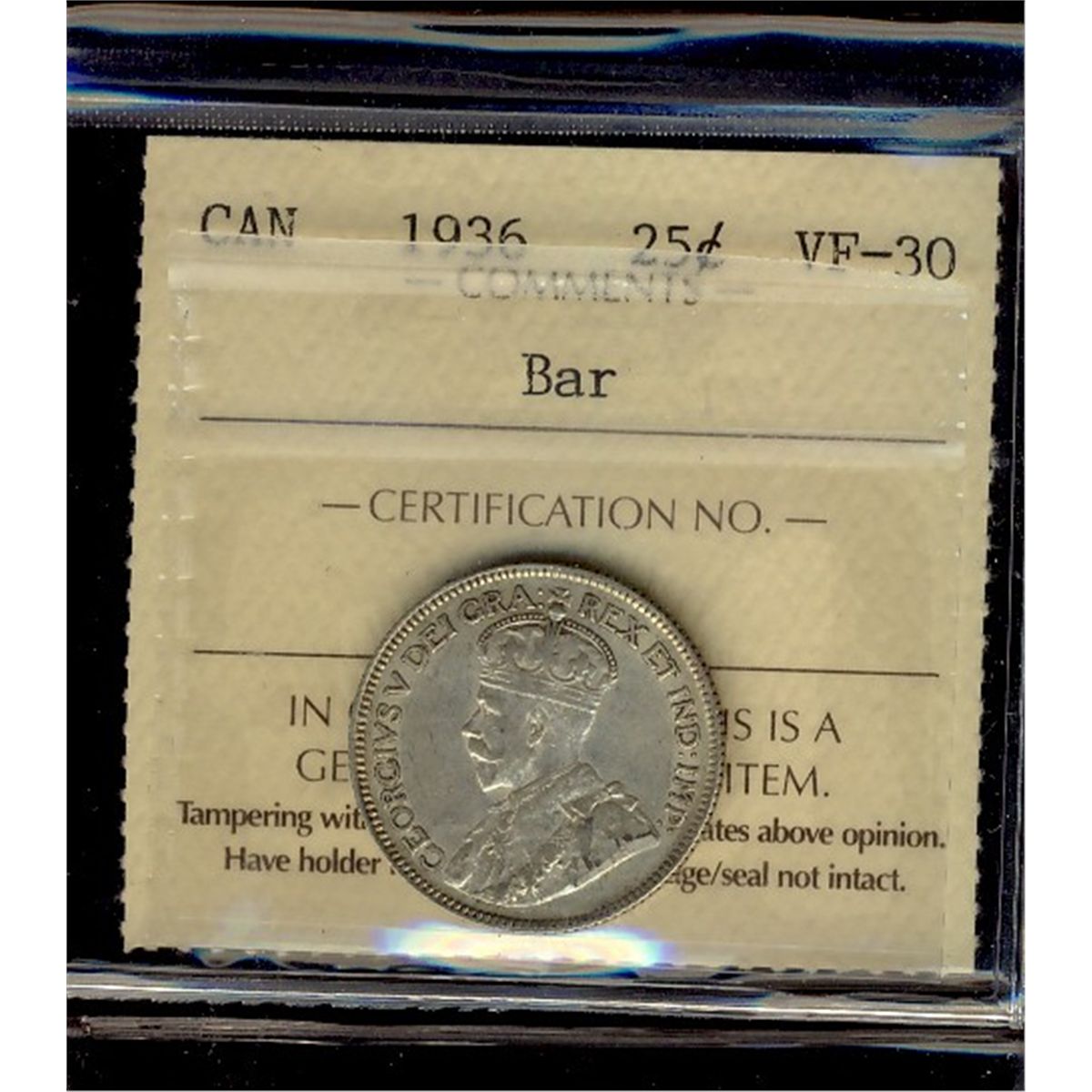 1936 25¢ Bar ICCS VF30.