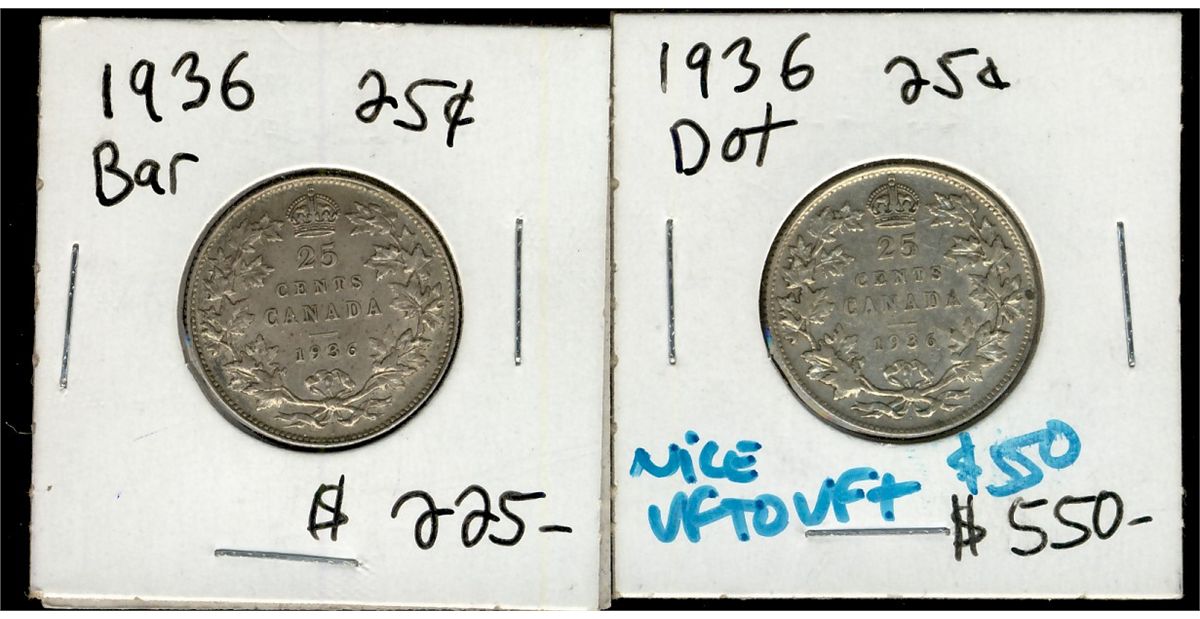 1936 25¢ Dot & Bar. Lot of 2 coins VF and better.