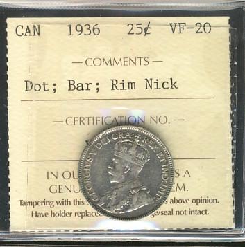 1936 25¢ Dot/bar ICCS VF20. Designated with rim Nick.
