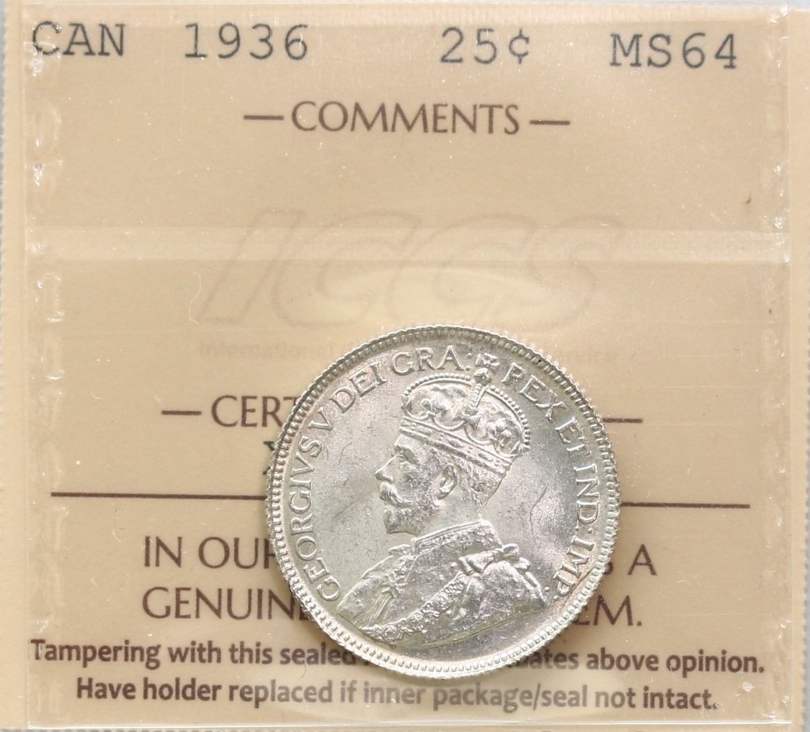 1936 25¢ ICCS Choice Mint State-64 Blast white example. Very flashy!