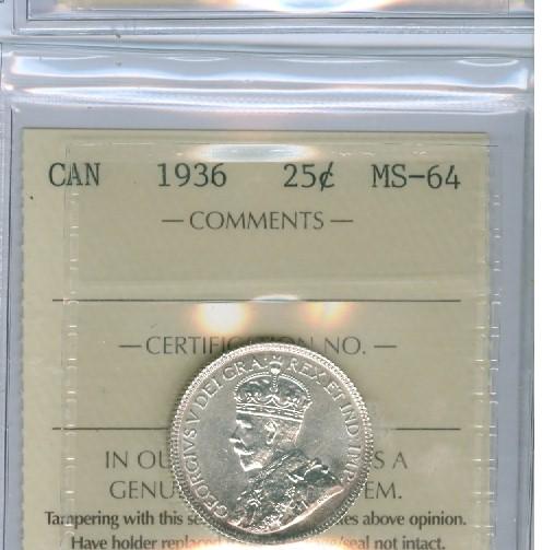 1936 25¢ ICCS MS64. Super eye appeal with lots of lustre.