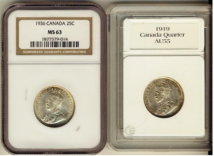 1936 25¢ NGC MS63 & 1919 uncertified AU55 example with lustre.