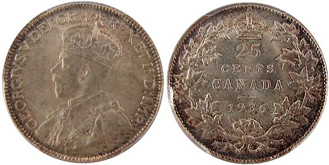 1936 25¢ PCGS MS65; Golden and pink toning.
