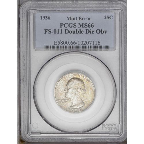 <B>1936<25C>--Doubled Die Obverse--MS66 PCGS.</B></I> FS-011. IN GOD WE TRUST shows separation of hubbed impressions, while LIBERTY and the date have very thick letters. Lime and orange streaks overlie the cream-gray obverse. The reverse is lightly toned but displays a few ebony dashes. A high grade example of this prominent doubled die variety.