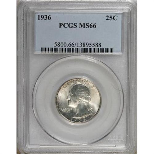 <B>1936 25C MS66 PCGS.</B></I> PCGS Population (385/52). NGC Census: (411/86). Mintage: 41,303,836. Numismedia Wsl. Price for NGC/PCGS coin in MS66: $152. (#5800)<BR><BR><B>Coin Engraver:</B> John Flanagan<BR><BR><b>Shipping:</b> Coins & Currency (<a target="_blank" href="http://www.heritageauctions.com/common/shipping.php">view shipping information</a>\)