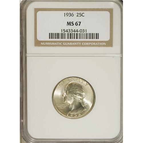 <B>1936 25C MS67 NGC.</B></I> The beautifully lustrous surfaces show a slight hint of smoke-gold patina. Essentially pristine, and nearly unexcelled at either service. Census: 85 in 67, 1 finer (4/07).<BR><BR><b>Shipping:</b> Coins & Currency (<a target="_blank" href="http://www.heritageauctions.com/common/shipping.php">view shipping information</a>)