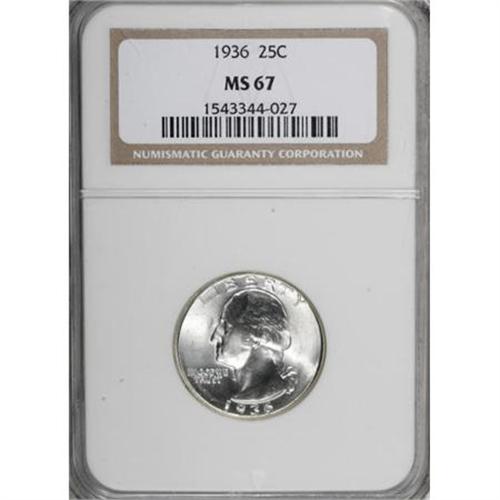 <B>1936 25C MS67 NGC.</B></I> NGC Census: (85/1). PCGS Population (52/0). Mintage: 41,303,836. Numismedia Wsl. Price for NGC/PCGS coin in MS67: $650. (#5800)<BR><BR><B>Coin Engraver:</B> John Flanagan<BR><BR><b>Shipping:</b> Coins & Currency (<a target="_blank" href="http://www.heritageauctions.com/common/shipping.php">view shipping information</a>)