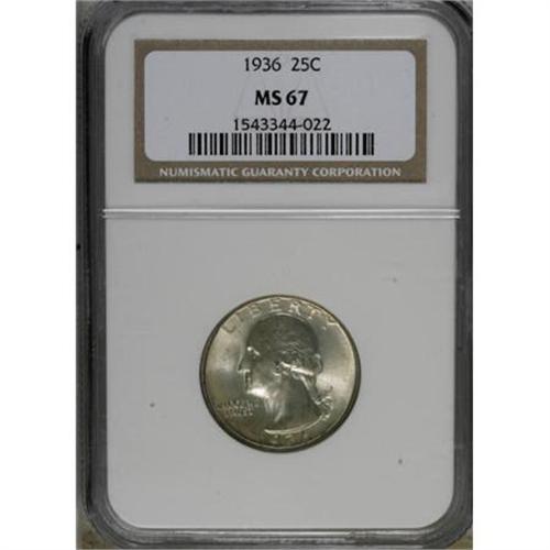 <B>1936 25C MS67 NGC.</B></I> NGC Census: (85/1). PCGS Population (52/0). Mintage: 41,303,836. Numismedia Wsl. Price for NGC/PCGS coin in MS67: $635. (#5800)<BR><BR><B>Coin Engraver:</B> John Flanagan<BR><BR><b>Shipping:</b> Coins & Currency (<a target="_blank" href="http://www.heritageauctions.com/common/shipping.php">view shipping information</a>)
