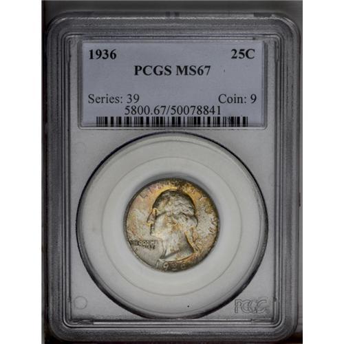 <B>1936<25C> MS67 PCGS.</B></I> Lustrous surfaces exhibit splashes of multicolored toning. An exquisitely preserved coin with well struck design elements. Population: 48 in 67, 0 finer (3/06).