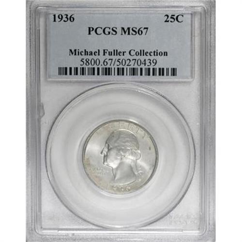 <B>1936 25C MS67 PCGS.</B></I> This early Washington quarter issue is surprisingly scarce at the MS67 grade level, despite a substantial mintage. This well struck example displays impressive satin luster and only hints of creamy coloration. Both sides are blemish-free, and a couple of tiny charcoal-colored specks in the right obverse field are of little import. Population: 52 in 67, 0 finer (8/07). <BR><I><BR>From The Michael Fuller Collection.</B></I><BR><BR><B>Coin Engraver:</B> John Flanagan<BR><BR><b>Shipping:</b> Coins & Currency (<a target="_blank" href="http://www.heritageauctions.com/common/shipping.php">view shipping information</a>)