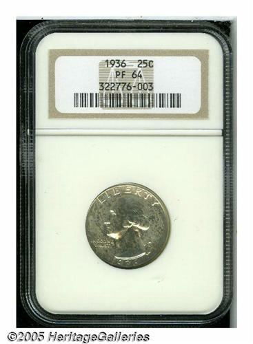 <B>1936<25C> PR64 NGC.</B></I> Dappled golden-tan and cream-gray colors confirm the originality of this exquisitely struck and undisturbed Choice first year proof Quarter.