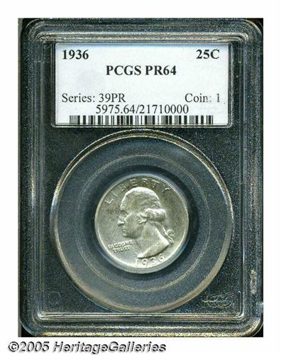 <B>1936<25C> PR64 PCGS.</B></I> Dappled olive-gold color visits selected areas of this bright proof. The design features are sharply impressed, and there are no serious marks to report.
