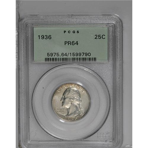 <B>1936<25C> PR64 PCGS.</B></I> Moderately mirrored with hazy toning and traces of russet at the periphery. Faint hairlines on the obverse are only visible under magnification. Housed in a green label holder.