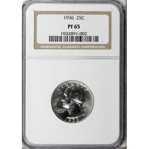 <B>1936 25C PR65 NGC.</B></I> This was the first year for proofs in the Washington quarter series, as the U.S. Mint had not produced proof coinage since 1916. This Gem example is brilliant and essentially untoned, with silver-gray surfaces that are highly reflective and show just a small degree of milkiness in the upper left obverse field. <BR><BR><B>Coin Engraver:</B> John Flanagan<BR><BR><b>Shipping:</b> Coins & Currency (<a target="_blank" href="http://www.heritageauctions.com/common/shipping.php">view shipping information</a>)