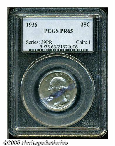 <B>1936<25C> PR65 PCGS.</B></I> A lovely Gem Proof example that exhibits attractive silver surfaces and a diagonal swath of bluish-lilac across the obverse.