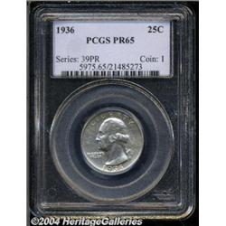 <table><tr><td><table><tr><td>1936 25C PR65 PCGS. Brilliant, untoned mark-free surfaces are displayed on this first proof issue of the Washington quarter series. Population: 187 in 65, 88 finer (3/04). <BR><BR><B>Important notice:</B> Heritage usually auctions material at the rate of 200-250 lots per hour. On some occasions eBay Live bid software or the Internet may not be able to keep up with the pace of the auction. We recommend placing a realistic absentee bid now as insurance to avoid disappointment. Occasionally the auctioneer may eliminate or reject an eBay Live bid, and the auctioneer may also reopen a lot after the close of the eBay live bidding (usually because we missed an audience bid), and may reject your bid even if it shows you as the winning bidder. By bidding via eBay Live, you agree that Heritage may award the lot to another bidder at its sole discretion under the circumstances described above or any other reasonable circumstances. Since eBay bids are not shown to us until we open the lot on the floor, we treat those bids just like floor bids. In most cases the floor responds before the eBay bid is presented to us, due to Internet lag time, so for consistency we have made it a policy that floor bids are always considered first over tie eBay live bids. Also please note that all Heritage lots purchased through eBay Live carry a 20% Buyer's Premium. Please make sure you read the Terms and Conditions before you bid. <BR><BR><B>IMPORTANT ANNOUNCEMENT ABOUT RESERVES:</B> Heritage now divulges all reserves on its web site 7 days before every auction. If you want to know whether the reserve on this lot has been met, and if not, what the reserve amount is, please visit this lot page on the HeritageCoin.com web site, or email: bid@HeritageGalleries.com </span></font></td></tr></table></td></tr></table>