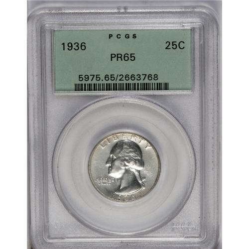 <B>1936<25C> PR65 PCGS.</B></I> Light plum-gray toning graces the obverse border of this otherwise brilliant Gem. Precisely struck, and pleasing despite faint mint-made laminations on the left obverse. Certified in a green label holder.