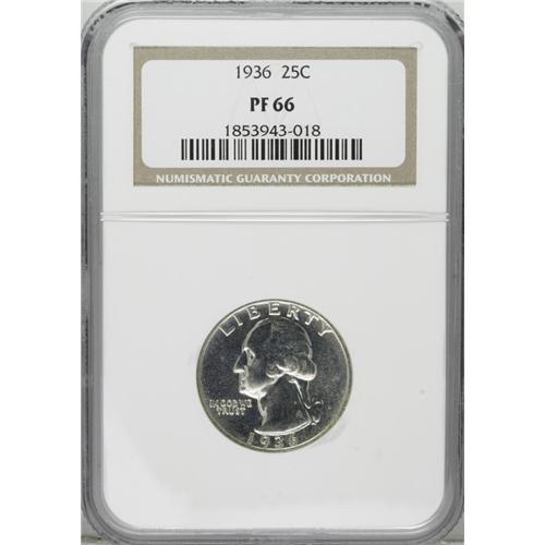 <B>1936 25C PR66 NGC.</B></I> Bright reflective surfaces exhibit just a hint of speckled milky coloration on the reverse. The design elements are well struck, and close scrutiny with a loupe reveals no mentionable impairments. This issue is difficult to locate any finer; NGC has seen only 17 pieces that grade higher, and PCGS has graded eight coins finer.<BR><I>From The Twin Hollows Collection, Part Two.</B></I><BR><BR><b>Shipping:</b> Coins & Currency (<a target="_blank" href="http://www.heritageauctions.com/common/shipping.php">view shipping information</a>)