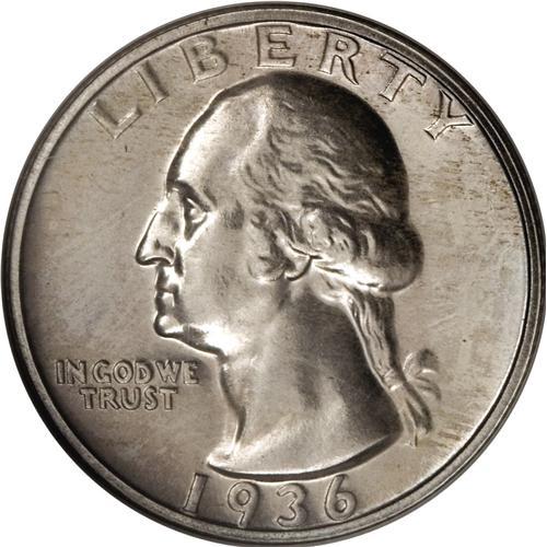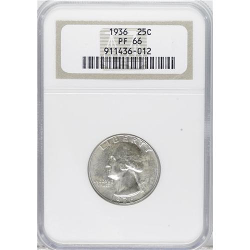 <B>1936 25C PR66 NGC.</B></I> Faint ivory and gold toning covers brilliant silver surfaces on both sides of this Premium Gem proof. Although little contrast is evident, the obverse and reverse mirrors are deeply reflective. A collection of 1936 to 1942 proof Washington quarters, or a 1936 proof set, would provide a perfect resting spot for this beauty.<BR><BR><b>Shipping:</b> Coins & Currency (<a target="_blank" href="http://www.heritageauctions.com/common/shipping.php">view shipping information</a>)