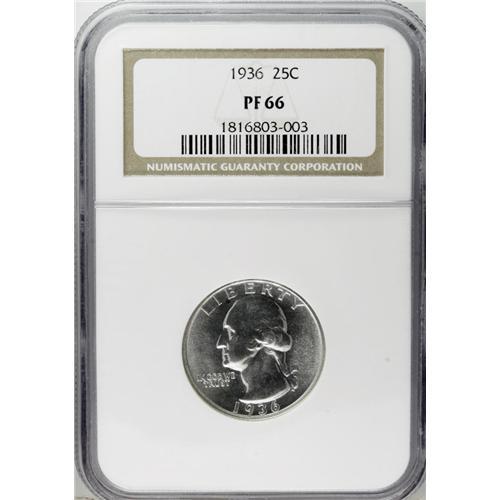 <B>1936 25C PR66 NGC.</B></I> The first proof Washington quarters were struck in 1936, after a 20 year intermission in the production of proof quarters. Thus, this issue represents the first year of the type for collectors of proof coinage. It is a Premium Gem with brilliant silver surfaces on each side, and it is just shy of the finest certified. NGC has graded just 16 finer pieces (10/06).<BR><I>From The Park Cities Collection.</B></I><BR><BR><b>Shipping:</b> Coin/Currency (<a target="_blank" href="http://www.heritageauctions.com/common/shipping.php">view shipping information</a>)