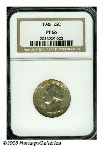 <B>1936<25C> PR66 NGC.</B></I> This Gem Proof has mostly brilliant silver surfaces with the typical dusky brown toning so often seen on original examples from the era. The surfaces are immaculate with mirrored fields and reflective devices. With the advent of population data, it is now recognized that the Proof coinage of 1936 is not as rare as once thought, but it is also recognized that Gem quality examples such as this remain difficult to locate. Population: 109 in 66, 14 finer (5/05).<BR><I>From The Clifford Columbus Collection.</B></I>