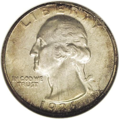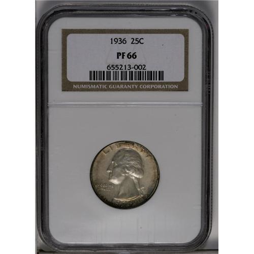 <B>1936<25C> PR66 NGC.</B></I> This intricately struck specimen is originally toned in cream-gray, lemon, and rose-red colors. Thorough inspection locates only one unimportant graze, located on the left obverse field (and is extremely difficult to discern). The quarter has the lowest mintage among the 1936 proof denominations, which were sold singly as well as by the set.