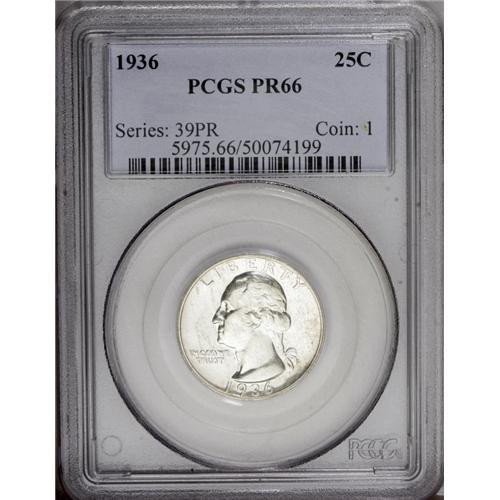 <B>1936<25C> PR66 PCGS.</B></I> 1936 is the key date of the proof Washington quarter series, since the mintage is about two-thirds that of its closest competitor, the 1937. The present specimen appears immaculate and is adorned with original pearl-gray and tan toning.<BR><I>From The Houston Collection of Washington Quarters.</B></I>