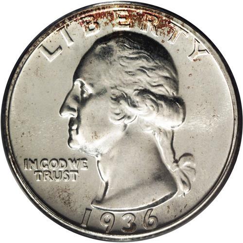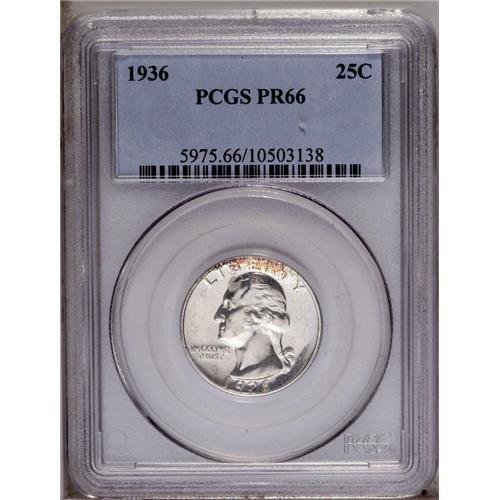 <B>1936<25C> PR66 PCGS.</B></I> A thin veil of mottled patina has little effect on the underlying deep, watery brilliance. By a wide margin, the key issue among Washington quarter proofs and just an outstanding specimen. Population: 110 in 66, 8 finer (3/06).