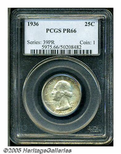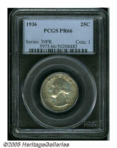 <B>1936<25C> PR66 PCGS.</B></I> The hazy golden-brown surfaces also display a few tiny spots of dark patina, particularly over the obverse. An obviously original specimen.