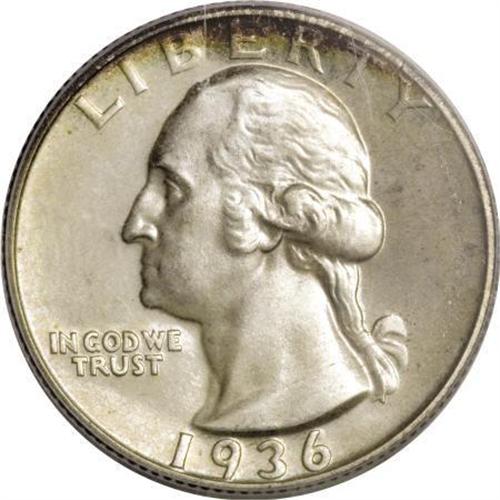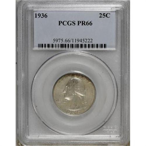 <B>1936 25C PR66 PCGS.</B></I> For aficionados of the Washington quarter series, unlike many modern U.S. coin series, there are no first-year proofs dating from 1932. The year 1936 was the first proof issue of quarters since 1915, and the famously low mintage of 3,837 pieces has made it an enduringly popular one. This piece boasts lustrous silver-white surfaces dusted with gold and lightly tinged with iridescent almond and charcoal near the rims. PCGS has certified only eight coins finer (3/08).<BR><BR><B>Coin Engraver:</B> John Flanagan<BR><BR><b>Shipping:</b> Coins & Currency (<a target="_blank" href="http://www.heritageauctions.com/common/shipping.php">view shipping information</a>)