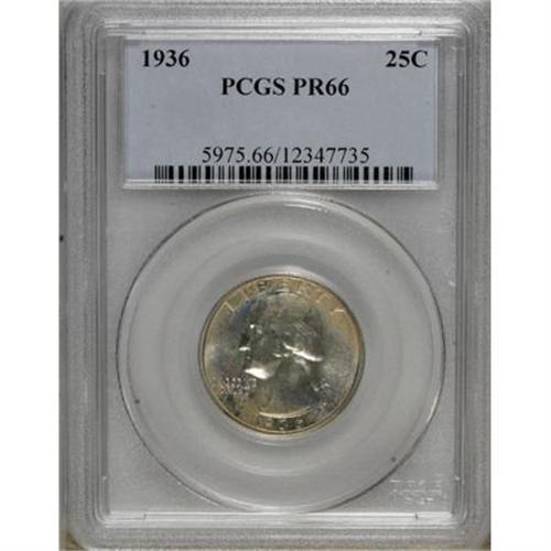 <B>1936 25C PR66 PCGS.</B></I> A veneer of light golden-tan and violet toning does not interfere with the brilliance emanating from this Premium Gem proof. This is a carefully preserved specimen that lacks mentionable flaws, and an attentive strike sharpens the design elements. David Bowers, in <I>A Guide Book of Washington and State Quarters,</B></I> says of the 1936: "Proofs are often seen on the market, but are the scarcest of any issue from this year to the present."<BR><BR><B>Coin Engraver:</B> John Flanagan<BR><BR><b>Shipping:</b> Coins & Currency (<a target="_blank" href="http://www.heritageauctions.com/common/shipping.php">view shipping information</a>)