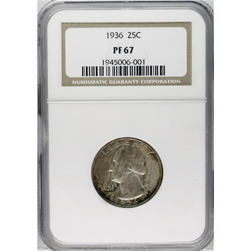 <B>1936 25C PR67 NGC.</B></I> Iridescent lemon, lime, gold, and salmon-pink invigorate the reverse, and visit the obverse periphery. Well struck and splendidly smooth. This first-year issue is the key to the proof Washington quarter series, since the mintage was only 3,837 pieces. Census: 17 in 67, 0 finer (1/07).<BR><BR><b>Shipping:</b> Coins & Currency (<a target="_blank" href="http://www.heritageauctions.com/common/shipping.php">view shipping information</a>)