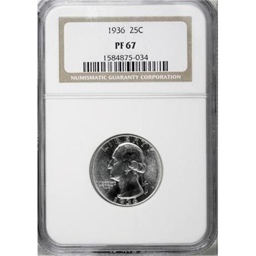 <B>1936 25C PR67 NGC.</B></I> Fully brilliant surfaces cover the surfaces of this Superb Gem proof quarter. These are complemented by well struck design features, and a lack of mentionable contact marks. A truly pleasing specimen that is sure to draw the attention of the advanced Washington quarter specialist. Census: 21 in 67, 0 finer (12/07).<BR><BR><B>Coin Engraver:</B> John Flanagan<BR><BR><b>Shipping:</b> Coins & Currency (<a target="_blank" href="http://www.heritageauctions.com/common/shipping.php">view shipping information</a>)