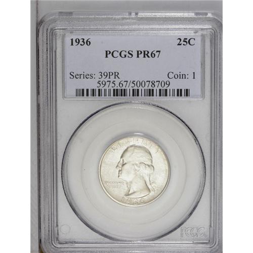 <B>1936<25C> PR67 PCGS.</B></I> Among the finest certified survivors of this early proof Washington quarter issue, the underlying surfaces sparkle beneath milky dusky-gold toning. Mark-free and undeniably pristine. Population: 8 in 67, 0 finer (1/06).